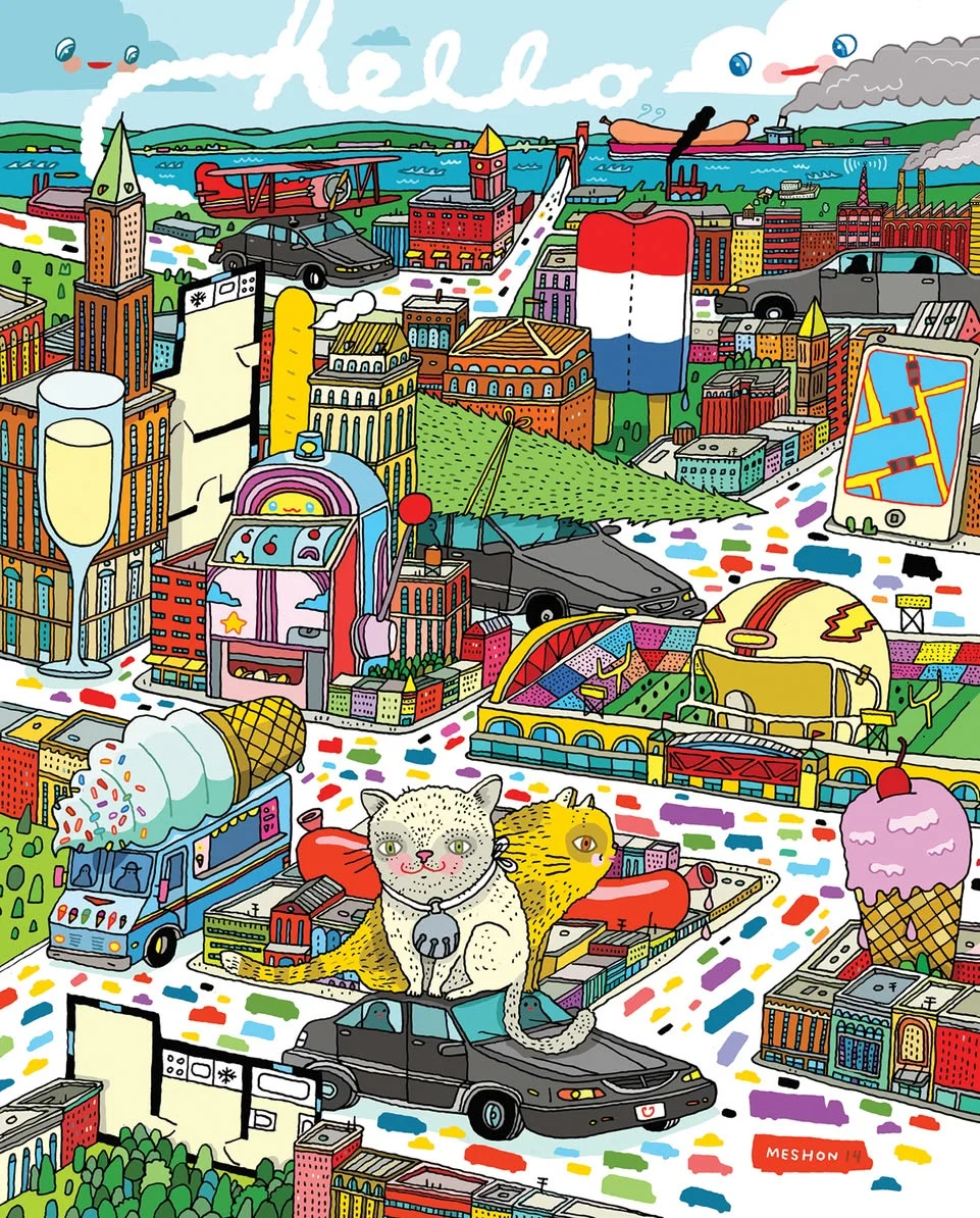Aaron Meshon illustrates and designs for magazines, advertisements, children’s products, murals, food trucks and books that can be found all over the world.